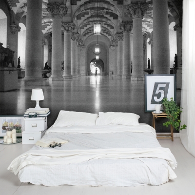A black and white photo of the interior of The Louvre in Paris. This photo has a grainy texture for an aged look. These removable and re-positionable mural panels are an easy way to decorate any wall in your home, nursery or office.