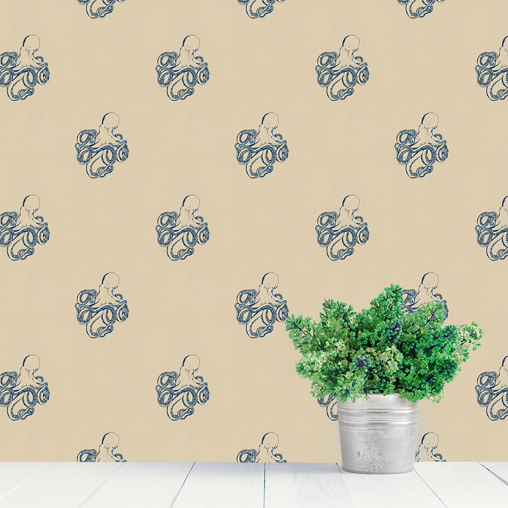A drawn octopus with a burlap-style background look. These nautical-themed removable wallpaper tiles are an easy way to decorate your bedroom, nursery or office.