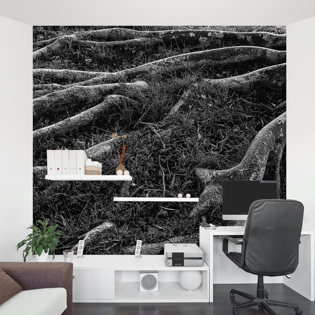 A black and white photo of tree roots.